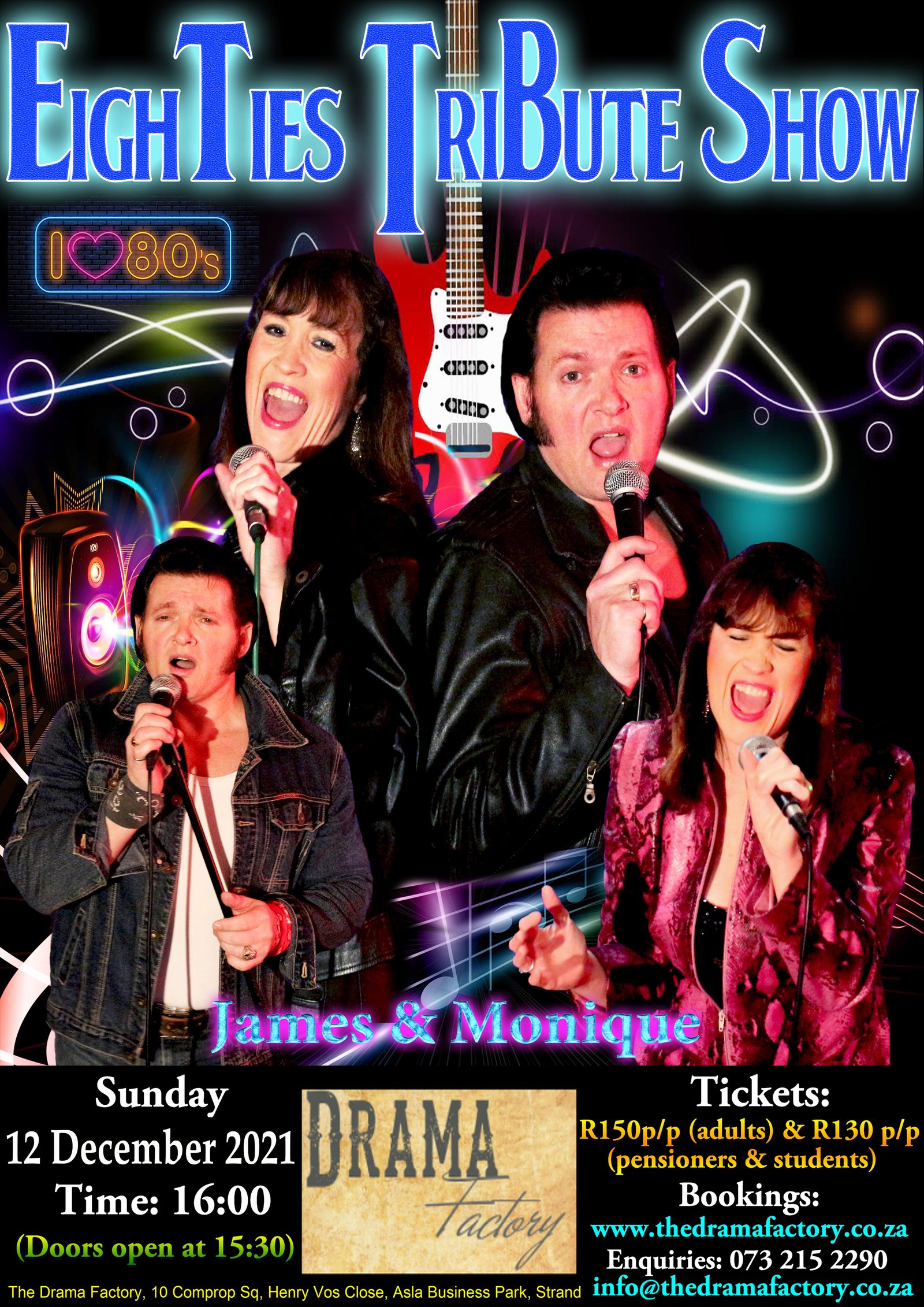 We really enjoyed the late afternoon, early evening show and the opportunity "to meet" James Marais and Monique Cassells. We admired their selection from the extensive range of songs popular during the 1980s. Their presentation of them was faultless. We rate both James and Monique 4 stars and an extra star for Monique for going to the trouble of her changes of clothes during the show. We look forward to their next visit to the Drama Factory