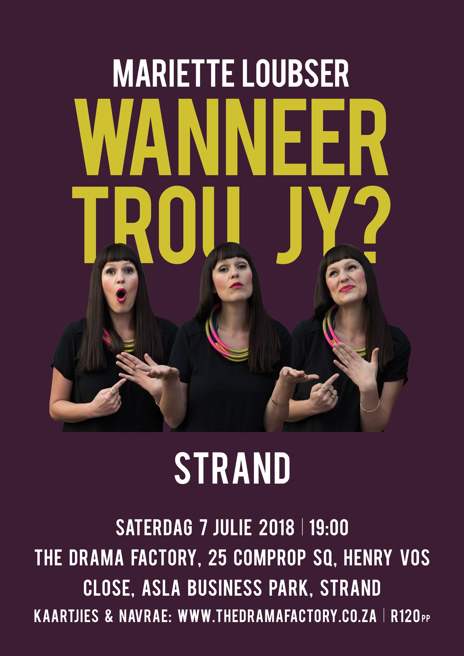 Wanneer trou jy? So 'n gepaste vraag, indien iemand verloof is. Indien nie, verskaf dit prima vermaak vir elkeen wat 'n eg Afrikaanse "Stand-Up comedy" wil beleef. Mariette Loubser die skrywer en komediant van "Wanneer trou jy? bied nie net teks maar ook sang in die vorm van parodie en eie komposisie soos sy vertel van vrae en flaters.