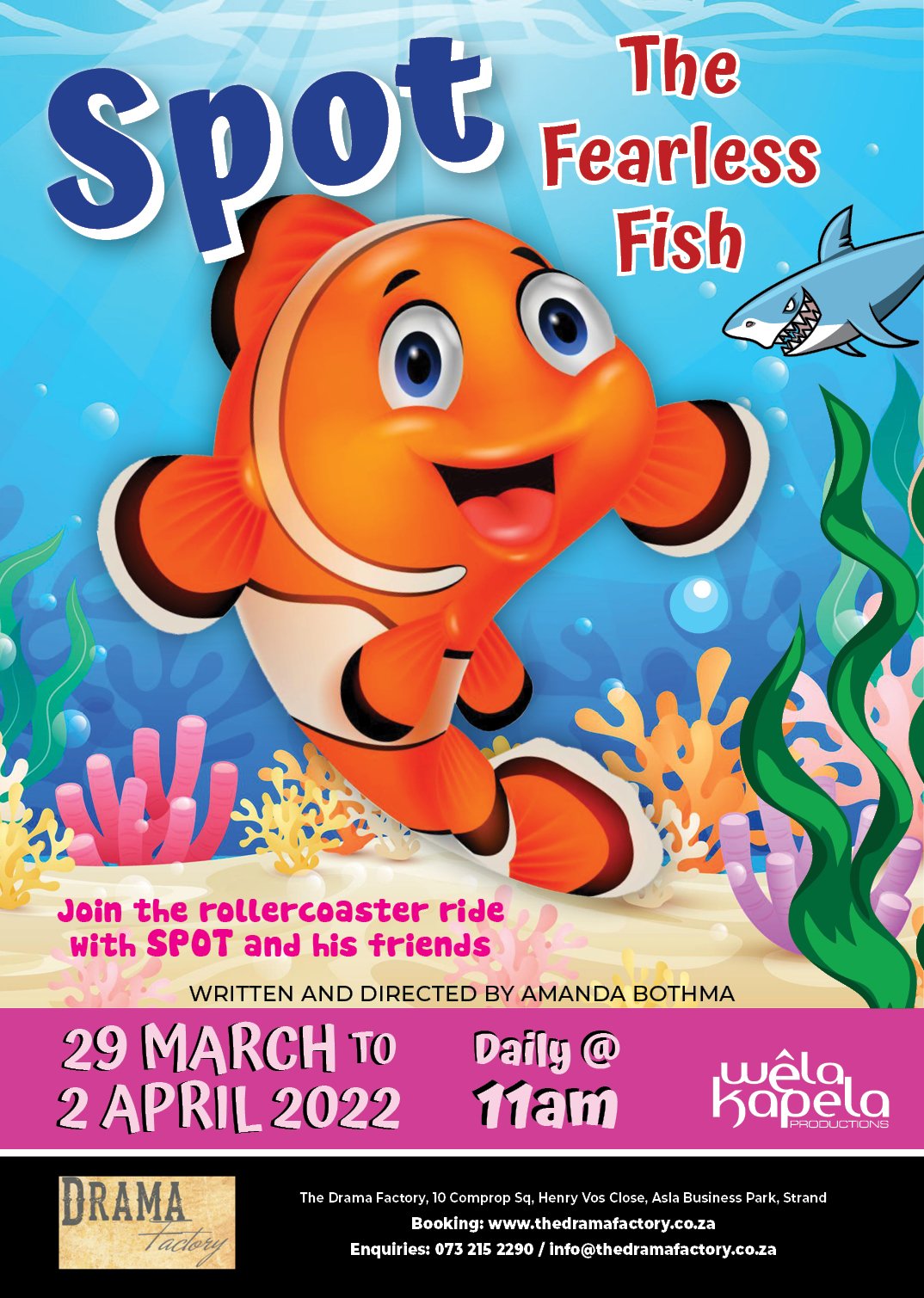 Spot the fearless fish is a puppet show developed to teach the young audience the danger of gangster bags (Single-use plastic) The style of the production is object theatre. The actors are all dressed in black and manipulate a school of blow-up fish, a turtle called Terry and Jab- Jab, the shark, and of course Gangster bags that invade the reef but Spot saves the day and deliver a powerful massage to reuse, reduce and recycle plastic.