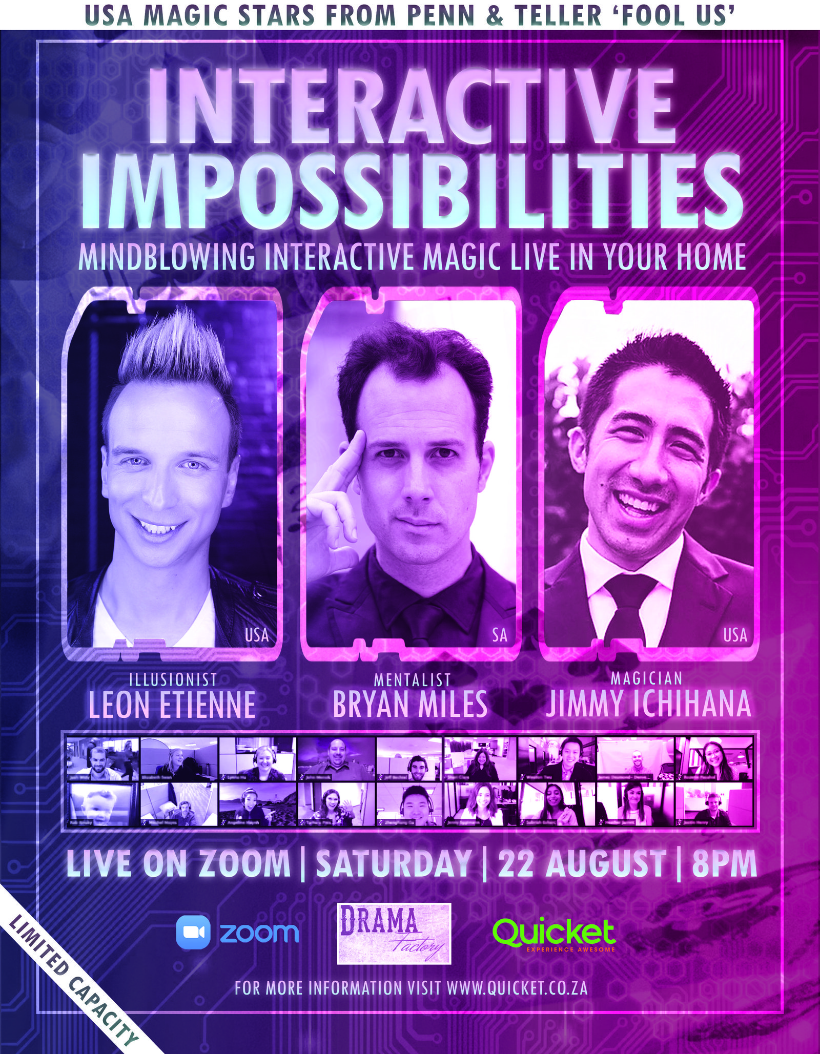 Interactive Impossibilities is a 55-minute online interactive magic show featuring three incredible performers; Illusionist Leon Etienne (USA), mentalist Bryan Miles, and magician Jimmy Ichihana (USA). After a string of successful sold-out online shows, this dynamic trio are bringing the show to South African audiences!