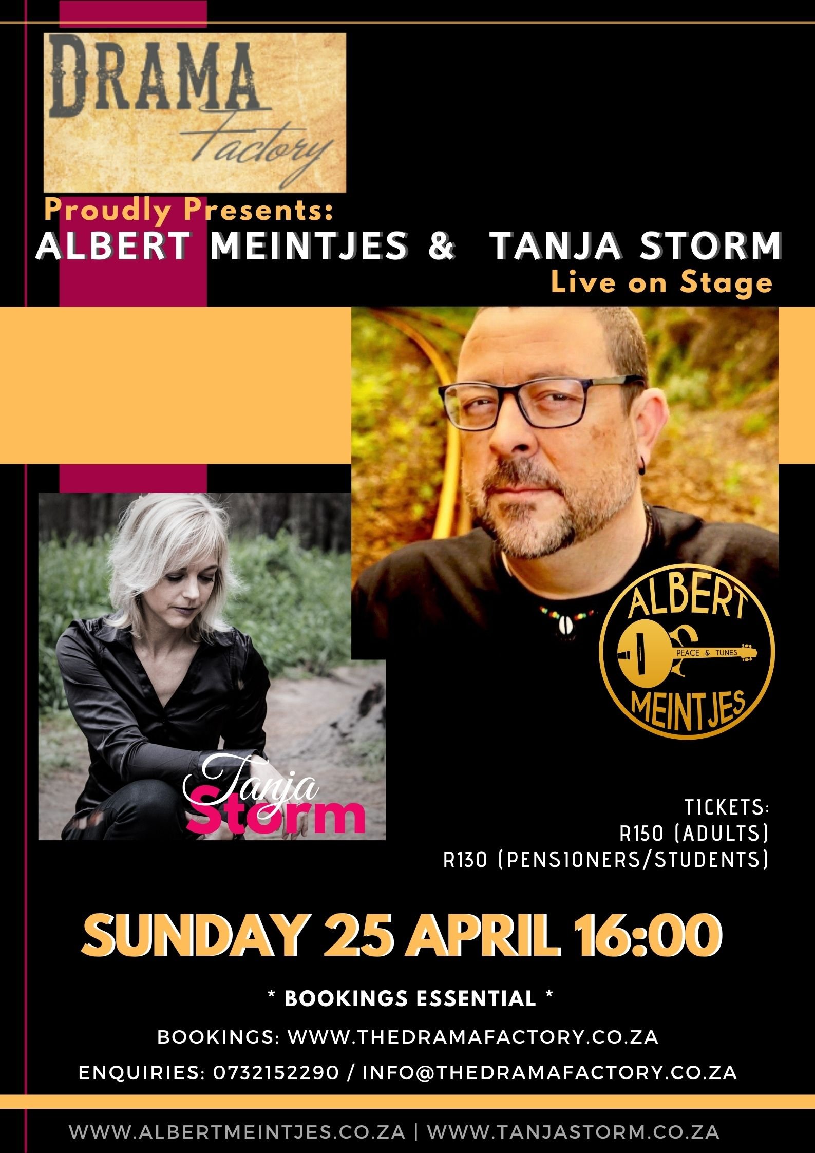Tanja Storm, gifted, prolific, creative & multi-talented, skilled vocalist & musical director, released her self titled debut album in 2009 and only recently returned to the studio after years of successful projects with various cover bands, collaborating with and backing other artists, and theatre work such as Rockolution: The Evolution of Rock. She released her new album, ‘Ek is Oppad’, featuring her popular hit songs, “Hi Hi” in 2019. Many of her music videos are on KykNet. Tanja worked remotely with other artists, including Albert Meintjes, to live stream their shows and record new material, during the Covid-19 outbreak in S.A. & the lockdown. She released 3 brand new singles during the lockdown and even arranged a theme song for a documentary. Albert Meintjes made his introduction to South African stages in 1996. He released 2 albums with Scioustic, one of which was “Algrecko”, featuring Greg Georgiandes. His much-anticipated debut solo album, “The Very Silence of Waiting in this Place", was successfully launched in April 2017. Albert performed his Tribute to Koos du Plessis in 2019 - 2020 & his latest hit song, “Freedom”, won him a Global Music Award in 2020. Both artists have shared stages with some of S.A.’s top artists, such as Albert Frost, Karen Zoid, Valiant Swart, Shaun Morgan (Seether), the late Johnny Clegg & Piet Botha, Black Cat Bones, Jan Blohm, Duncan Faure & Mel Botes, to name but a few.