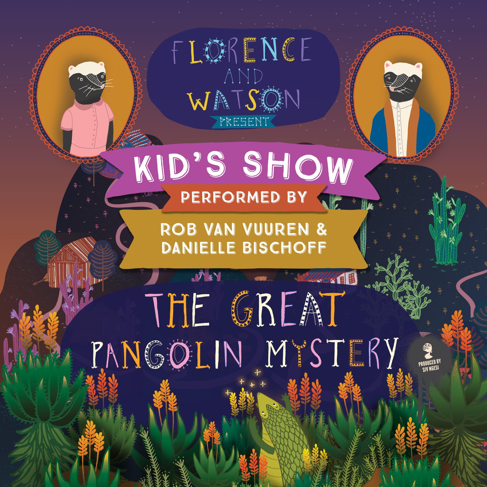Florence and Watson presents the Great Pangolin Mystery is the brand newshow from husband and wife team Rob van Vuuren and Danielle Bischoff.Following on from the success of Florence and Watson and the SugarbushMouse this new show takes the audience back to the magical village onSugarbush Mountain with its wonderful cast of crazy animal characters.Florence and Watson, the dancing, singing, narrating honey badgers re-introduceus to some old audience favorites including the bossy Mayor Henry Hadeda , theoverly dramatic Impi Impala and the grumpy but lovable Buffalo who once againcreate more problems for themselves while trying to solve their problems. Theshy but level headed and brave little Striped Mouse, Petal steps in again tospeak some sense to a village in panic and helps to recruit some new andinteresting characters. But will they solve the Great Pangolin Mystery?Come and find out!A show filled with music, comedy and adventure for the whole family teachingkids how to work together despite our differences and to raise awareness for theplight of the Pangolin which is currently the worlds most illegally trafficked mammal.