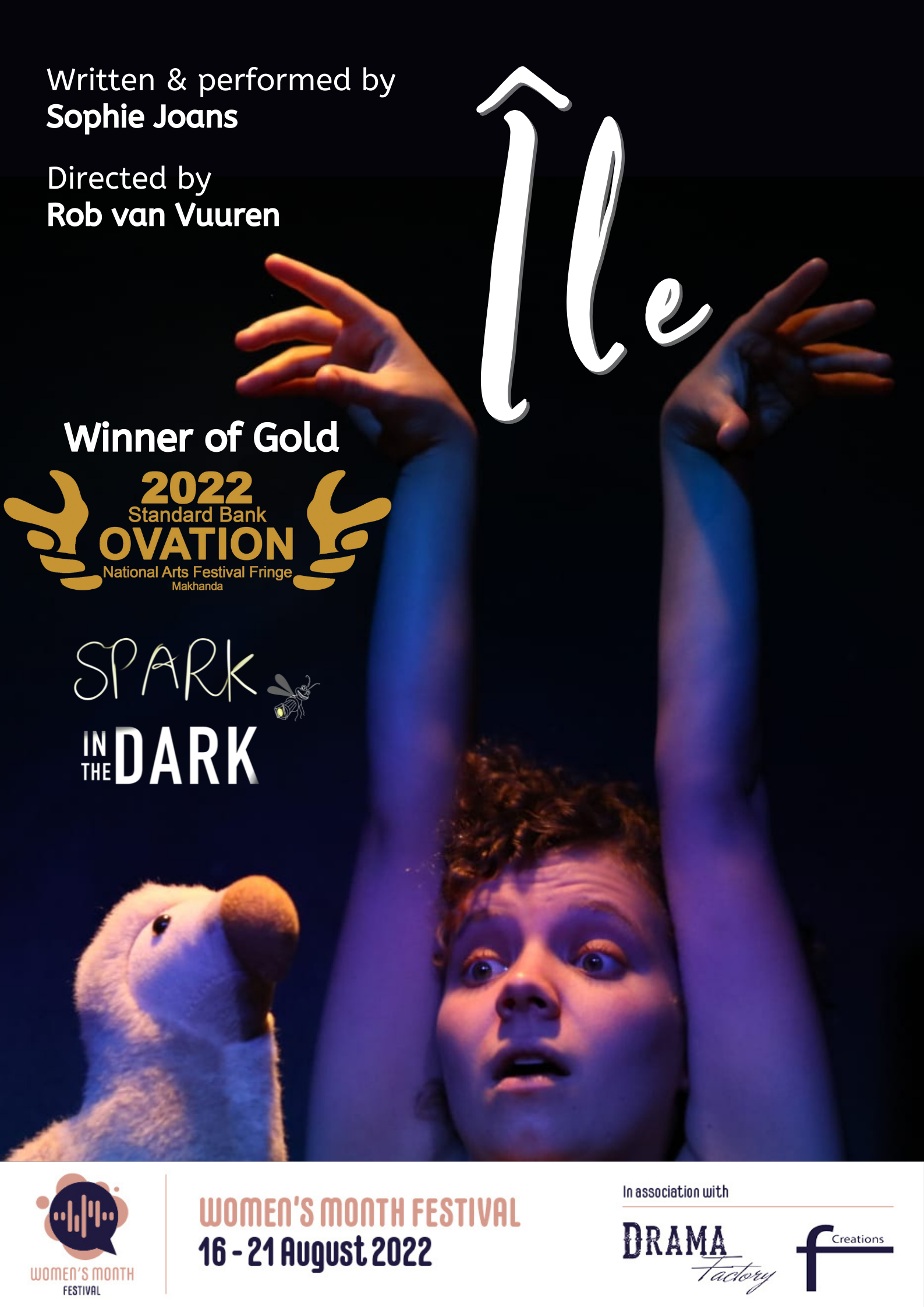 Her previous works include two-hander The Flower Hunters (2021 – Winner of Standard Bank Ovation Award) and puppet show Do You Dream In Colour (2018 – Winner of Zabalaza Festival’s Most Innovative Play). She collaborated on the short film, Verloren (2021 – Winner of Standard Bank Silver Ovation Award). Île is her debut solo play.
